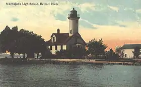 | Mamajuda | 42° 11′ 32″ N, 83° 08′ 10″ O | États-Unis, dans la rivière Détroit | Un phare fut bâti en 1849 sur cette île fluviale de 12 ha. Son gardien et sa famille en étaient les seuls habitants. Une érosion lente fit sombre le phare en 1950, et disparaître l'île vers 1960. N'en subsiste qu'un banc de sable et quelques blocs, tous totalement immergés[44]. | C | ![]() |