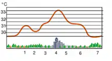 Dans les villes, la température peut être de 10 °C plus élevée que dans les zones environnantes. Cela peut aussi provoquer une augmentation significative des précipitations[34].