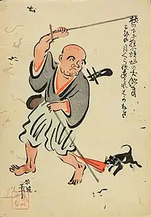 Une image Otsu-e était particulièrement appréciée pour son ambivalence. Elle représente un musicien aveugle qui repousse un chien pendu à ses vêtements traînants. Le but moral originel était « de mettre en garde afin de ne pas être pris au dépourvu, l’écharpe flottante représentant un esprit peu ferme ou flou. Cependant, vers le milieu du XIXe siècle, l’image pouvait être interprétée comme une satire du déclin du pouvoir du shogunat Tokugawa, l’aveugle représentant le gouvernement pris au dépourvu par les agressions des puissances étrangères, symbolisées par le chien[9]. » Utagawa Toyokuni I fit sien le thème dans une estampe montrant deux aveugles frappant des chiens qui aboient sur leurs talons[10]. Kuniyoshi alla plus loin dans la série qu'il créa sous le nom de Hodomoyoshi, incorporant dans ses gravures une image Ōtsu-e dans un coin, au-dessus de sa propre imitation, plus dynamique de la scène[11]. Le thème de l'homme aveugle attaqué par un chien est également réinterprété avec l'image du guerrier Shimizu Kwanja Yoshitaka levant son épée face à un rat géant qui est en train de ronger la fin d'un rouleau qu'il porte[12]. De cette façon, Kuniyoshi fait appel à la tradition populaire d'une production en série à une époque où sa propre version, plus élégante, la remplace.