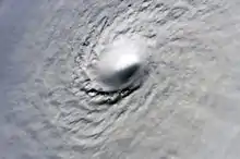 L'œil est constitué par de l'air subsident (mouvement descendant)[1],[3],[4],[5],[Note 1] entouré d'un mur de nuages orageux (cumulonimbus) dans lequel les mouvements ascendants sont rapides. Les températures chaudes de l'œil s'expliquent par la compression adiabatique de l'air subsident. La plupart des sondages effectués dans l'œil montrent que les basses couches restent relativement humides avec une inversion de température au-dessus, ce qui tendrait à démontrer que les couches supérieures d'air subsident de l'œil n'atteignent pas le sol mais restent cantonnées à une altitude de 1 à 3 km de la surface[1].