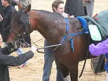 Les œillères australiennes, spécifiques aux courses de plat, consistent en une peau de mouton ajoutée au montant de la bride.