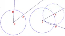 Pour reporter l'angle de O en I, avec la règle et le compas, tracer deux cercles de même rayon centrés en O et I, tracer les points A et B intersection des côtés de l'angle avec le cercle de centre O, choisir un point C sur le cercle de centre I, et reporter la longueur AB en traçant un troisième cercle de centre C qui coupe le deuxième cercle en D (et en un autre point).