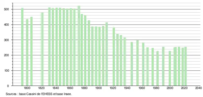 L'évolution du nombre d'habitants est connue à travers les recensements de la population effectués dans la commune depuis 1793. Pour les communes de moins de 10 000 habitants, une enquête de recensement portant sur toute la population est réalisée tous les cinq ans, les populations légales des années intermédiaires étant quant à elles estimées par interpolation ou extrapolation[31]. Pour la commune, le premier recensement exhaustif entrant dans le cadre du nouveau dispositif a été réalisé en 2007[32].