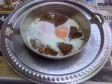 Oribase (IVe siècle) considère les œufs à la poêle (qui ont tout l'air d'œufs brouillés) comme « une nourriture très mauvaise sous tous les rapports »[44]. Menon (1755) en donne une recette d'œufs à la poêle faite d'œufs durs revenus dans beurre, lard, échalote et champignons[45]. C'est après 1850 que la recette moderne est fixée : F. Vidalein distingue des œufs au plat « mais cuits dans une poêle chaude » (le beurre prend une couleur rousse) qu'ils remuent tout le temps de la cuisson[46]. À cette époque, ce sont des entrées[47].