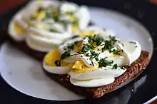 Le sandwich à la salade aux œufs (Egg salad sandwich) est une salade d'œufs durs coupés en petits morceaux, de ciboulette et souvent de céleri haché croquant à la mayonnaise tartinée sur un pain de mie, spécialement apprécié en Amérique du Nord[37]. Ces salades d'œufs, salade aux œufs, œufs en salade sont anciennes dans la langue française et évoquent une filiation des garnitures jusqu'à l'œuf mayonnaise, comme celle de François Massialot (1722) avec « anchois, câpres, fenouil, laitues, betteraves, pourpier et cerfeuil »[38],[39]. L'apparition de l'Egg salad dans la langue anglaise et nettement plus tardive (vers 1880)[40].