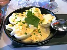 Souvent les œufs mayonnaise désignent des salades d'œufs en morceaux mélangés à de la mayonnaise (яйчена майонеза bulgare par exemple)[35].