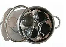 Pour les sac à pocher, il existe divers pochoirs ou pocheuse à œufs en forme de poche[34], de cuillère[35], de moule, souvent en silicone ou en tamis d'acier avec couvercle silicone[36] dans lesquels on casse l'œuf qui est maintenu une fois dans le liquide. Le blanc reste resserré autour du jaune. Les sachets à pocher les œufs coniques en papier renforcé permettent une cuisson facile avec un contact avec le liquide mais donnent des œufs curieux en forme de fond de sachet[37]. Une poche de film alimentaire résistant à la chaleur et huilé évite de même la dispersion du blanc dans l'eau mais la cuisson se fait sans contact avec le liquide[38]. Les pocheuses à œufs à moules individuels avec cuisson à la vapeur donnent des œufs pochés compacts mais sans contact entre l'œuf et le liquide de cuisson.