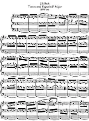 | BWV 540 | Toccata et fugue | Fa majeur | La fugue date probablement de 1716, durant la période de Weimar ; le prélude est composé entre 1717 et 1723 à Köthen, mais certains analystes l'estiment plutôt de 1734 ; et d'autres la considèrent comme écrite pour Johann Ludwig Krebs, donc probablement à Buttstädt en 1712. Cette œuvre est en tous les cas indissociable de la toccata dorienne en ré mineur, avec de nombreuses parentés, notamment l'utilisation du stile antico dans la Fugue. La Toccata est la plus longue pièce pour orgue de Bach, avec 438 mesures. Elle s'ouvre sur un canon joyeux et très long repris ensuite à la basse ; dans un second temps de la même pièce, de nombreuses imitations reprennent des éléments de ce canon dans un polyphonie concertante empruntée à la musique italienne. La Fugue, écrite dans le style d'un ricercare, lie deux sujets présentés distinctement[29],[30]. |