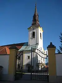 L'église paroissiale, qui a donné son nom au village, est consacrée à Saint Pierre et appartient au diocèse catholique de Celje. Construite au XIIIe siècle et de style roman, elle a été partiellement transformée dans le style gothique et baroque ; les dernières modifications remontent à 1913. Dans l’église se trouve une statue de la Vierge datant de 1320. Le reste du mobilier et des objets datent, pour la plupart, du XVIIIe siècle, XIXe siècle et XXe siècle[5].