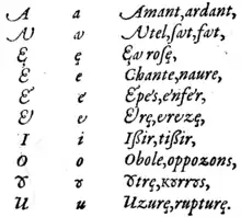 Les cornes de bélier (majuscules et minuscules) sont déjà utilisées comme lettre en 1574 dans le livre Etrenes de poezie frasoeze an vers mezures de Jean-Antoine de Baïf[10], utilisant l’alphabet français de Pierre de La Ramée, pour représenter la voyelle fermée postérieure arrondie française /u/ normalement écrite ‹ ou ›. La Ramée composa cette lettre comme ligature o sous un u[11] ressemblant ainsi à la ligature grecque ου ou à la lettre latine ou ‹ ȣ › ou ‹ ᴕ ›. Jean-Antoine de Baïf utilise d’ailleurs la forme de la ligature ou dans ses manuscrits écrits avec une variation de l’alphabet français de La Ramée.