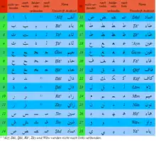 Les tableaux ci-dessous donnent la valeur de chacune des vingt-huit lettres de l'alphabet arabe[4]. À noter que ces tableaux présentent, du premier au dernier, un ordre alphabétique ancien (dit « ordre levantin ») dans lequel le classement des lettres correspond à la progression des nombres. Le classement actuel de l'alphabet arabe suit un ordre différent (voir tableau à droite), si bien que les nombres sont dans le désordre.