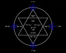 Représentation graphique de l'étoile kabbalistique, les noms de Dieu et les noms des quatre anges en hébreu.