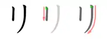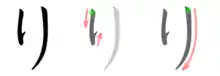 L'hiragana り possède deux graphies, selon qu'on fond ou non les traits qui le composent. Dans le cas où ils sont distincts, il s'écrit en deux traits.
