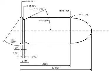 - désignation métrique : 11,43 × 23 mm ;
