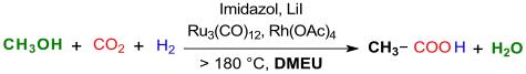 La 1,3-diméthyl-2-imidazolidinone (notée DMEU dans la réaction ci-dessous) a servi de solvant avec un catalyseur ruthénium-rhodium, de l'imidazole comme ligand et de l'iodure de lithium LiI comme promoteur a permis la synthèse de l'acide acétique CH3COOH par hydrocarboxylation du méthanol CH3OH avec du CO2 et de l'hydrogène H2 à 200 °C[10] :