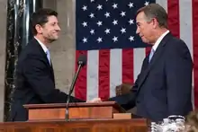 Le , John Boehner annonce à la surprise générale qu'il démissionne de son poste de speaker et de son mandat de représentant à la fin du mois d'octobre. Contesté par les représentants proches du Tea Party, il prend cette décision pour ne pas « entretenir le désordre »[4]. Kevin McCarthy, leader de la majorité républicaine à la Chambre, est alors le favori pour le remplacer. Le , nouveau coup de théâtre, alors que les républicains se réunissent pour choisir leur candidat, McCarthy annonce qu'il se retire de la course, face aux pressions de la droite du parti[5]. C'est finalement l'ancien candidat à la vice-présidence et représentant du Wisconsin, Paul Ryan, qui est élu président de la Chambre le : 236 représentants votent en sa faveur contre 184 pour Nancy Pelosi et neuf pour l'ultraconservateur Daniel Webster[6]. À 45 ans, il est le plus jeune speaker depuis James Blaine en 1875[7].