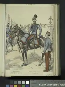 - Les 5e et 6e escadrons de réserve du régiment forment un groupement à Épinal à la mobilisation. Il est rattaché à la 71e division de réserve et est engagé dans les Vosges[15]. Il quitte le régiment en décembre 1914[16].
