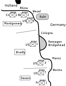 Le Rhin est un obstacle naturel dans l'avancée des alliés[19]. Mais son franchissement permettrait aux alliés d'avoir accès à la plaine d'Allemagne du Nord, et d'avancer jusqu'à Berlin et d'autres villes majeures d'Allemagne de Nord. Suivant une stratégie d'approche sur un large front décidé par le général Dwight D. Eisenhower, le commandement suprême des Forces expéditionnaires alliées, il fut décidé de tenter de franchir le Rhin sur différents lieux[20]. Le field marshal Bernard Montgomery, commandant le 21e groupe d'armées britannique, élabora un plan approuvé par Eisenhower, l'opération Plunder, afin de permettre aux forces sous son commandement de franchir le Rhin. D'après ce plan, la 2e armée britannique, sous le commandement du Lieutenant-général Miles Dempsey, et la 9e armée américaine, sous le commandement du Lieutenant-général William Simpson, devait franchir le Rhin à Rees, Wesel et au sud du canal de Lippe. Pour s'assurer que l'opération soit un succès, Montgomery insista pour qu'une composante aéroportée soit incorporée dans le plan afin de supporter les troupes amphibies: l'Opération Varsity[21]. Trois divisions aéroportées furent initialement choisies pour prendre part à Varsity: la 6e division aéroportée britannique, la 17e division aéroportée américaine et finalement la 13e division aéroportée; toutes furent rattachées au 18e corps aéroporté américain[5]. Cependant, il n'y avait pas assez d'avion de transport à disposition en Europe, et seulement deux divisions aéroportées pouvaient être utilisées. Ainsi la 13e division fut retirée de l'opération Varsity à cause de son manque d'expérience sur le front[4].
