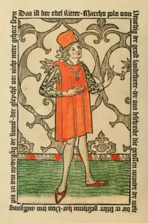 « Ceci est le célèbre chevalier, Marco Polo de Venise, le plus grand des voyageurs nous décrit les grandes merveilles du monde qu'il a vues de ses yeux. Du levant au couchant, on n'entendra plus jamais rien de semblable » (frontispice de la 1e édition imprimée, Nuremberg, 1477).