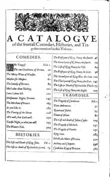 Sommaire du Premier Folio des œuvres de William Shakespeare, 1623.