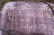 Inscription sur une pierre à la fin du voyage d'Alexander Mackenzie en 1792-1793 à travers le Canada traversant de Rivière-la-Paix à l'Océan Pacifique.