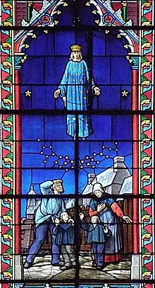 Vitrail de la basilique Notre-Dame d'Espérance de Pontmain représentant l'apparition de la Vierge Marie en 1871 ci-avant. - Janvier Sánchez Delgadillo (es) († 1927), prêtre et martyr mexicain.