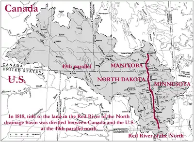 Le bassin de la rivière Rouge. La frontière au 49e parallèle Canada/États-Unis ampute la Terre de Rupert du territoire au sud de celle-ci.