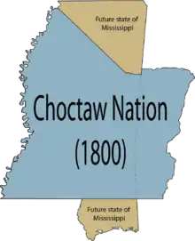 Le territoire des Choctaws (en bleu) par rapport à l'état du Mississippi.