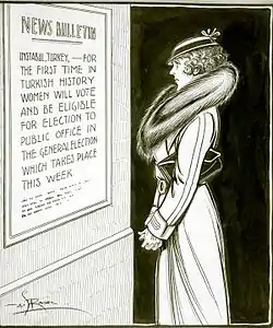 Caricature politique sur le droit de vote des femmes au Québec qui demeure la dernière province à ne pas l'avoir.