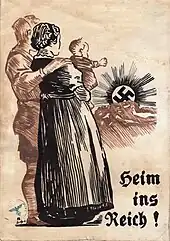 Heim ins Reich. Affiche de propagande nazie avec des costumes traditionnels du Tyrol du Sud.