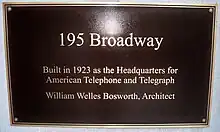 Le site était auparavant occupé par le Western Union Telegraph Building. Le gratte-ciel actuel, commandé après l'acquisition par AT&T de Western Union en 1909, a été construit de 1912 à 1916 sous la direction de Theodore Newton Vail, sur des plans de William W. Bosworth. Il a été le site d'une extrémité du premier appel téléphonique transcontinental, le premier appel intervilles Picturephone, et le premier appel téléphonique transatlantique. Bien que le siège social d'AT&T ait déménagé au 550 Madison Avenue en 1984, le 195 Broadway est toujours utilisé comme immeuble de bureaux en 2020.