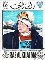 Nancy Greene représentée sur un timbre des Émirats arabes unis