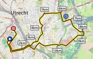 Le départ a lieu d'une rampe de lancement devant le complexe du Jaarbeurs Utrecht, dans l'avenue Truus van Lierlaan. Après 200 m, les coureurs tournent à gauche dans l’Overste den Oudenlaan. Après 500 m, ils atteignent un rond-point, tournent à gauche dans la Koningin Wilhelminalaan, effectuent une boucle de 12 km dans la ville sur un parcours entièrement plat et une vingtaine de virages pour la plupart larges. Ils retrouvent l’Overste den Oudenlaan et terminent le contre-la-montre dans la Croeselaan près du Jaarbeurs[1].