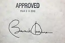 La signature du Président Barack Obama pour la loi de la réforme de l'assurance médicale à la Maison-Blanche, le .
