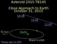 2015 TB145 (également écrit 2015 TB145), est un astéroïde géocroiseur potentiellement dangereux de la famille Apollon mesurant entre 280 et 620 mètres de diamètre. Il est passé à environ 1,27 distance lunaire de la Terre le [5], ce qui lui a valu le surnom d'« astéroïde d'Halloween » ou de « citrouille » ou ses variantes[6].