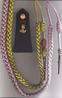 | Fourragères | aux couleurs du ruban de la Médaille militaire deux olives aux couleurs des rubans des Croix de guerre 1914-1918 et 1939-1945 aux couleurs du ruban de la Croix de guerre théâtre d'opérations extérieures |