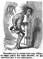 Un coup d'État, c'est une fiction (1849). Poursuivi par la crainte d'un coup d'État, un rouge passe des nuits blanches, ce qui contribue peu à son embonpoint... (1850). Deux caricatures raillant les craintes prétendument infondées des « rouges » républicains. | ||