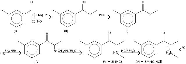 Il existe plusieurs façons de synthétiser la 3-MMC. L'une, adaptée de Power et al., ajoute du bromure d'éthylmagnésium au 3-méthylbenzaldéhyde (I). Le produit (II) est ensuite oxydé par du chlorochromate de pyridinium (PCC) sur gel de silice en cétone (III) et bromé avec de l'acide bromhydrique pour donner la bromocétone (IV). Cette bromocétone est mise à réagir avec de la méthylamine éthanolique pour produire la base libre 3-MMC (V), qui peut être convertie en sel chlorhydrate (VI) par addition de chlorure d'hydrogène éthéré (VI)[8].