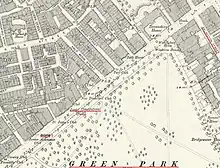 - et à l'ouest du club-house du Junior Constitutional Club (actuelle ambassade du Japon, aux nos 101-104)[3].