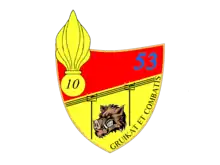 Écu de fantaisie d'azur bordé de gueules (bordeaux) à une carte d'Italie de candide, chargée d'un poteau et de fils électriques d'or, brochés d'un tau stylisé de turquin chargé d'un éclair et du nombre 53 d'argent accompagné de l'insigne de la 3e DIA et des nombres 83/84 en chiffres du second métal.