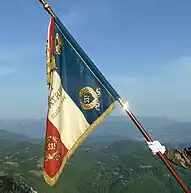 En soie, aux trois couleurs nationales et frange d’or, le drapeau porte l'inscription[1] « Italie 1944 », correspondant à la participation particulièrement brillante de la compagnie de transmissions 83/84 aux combats de la campagne d'Italie en 1944.