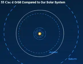 Lors de sa découverte, on pensait que 55 Cancri d avait une orbite assez faiblement excentrique semblable à celle de Jupiter dans le Système solaire, bien que les éléments orbitaux ne fussent pas encore précisément établis. Des observations ultérieures de l'étoile ont affiné les estimations, révélant que l'orbite de la planète est en réalité fortement excentrique[6].