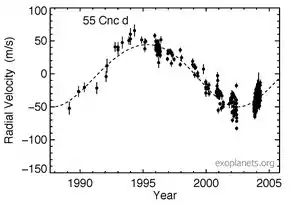 En 2002, de nouvelles mesures ont révélé la présence d'une planète à longue période orbitale orbitant à environ 5 UA de l'étoile, planète appelée 55 Cancri d[4]. Ces mêmes mesures révélèrent la présence d'une autre planète interne, 55 Cancri c.