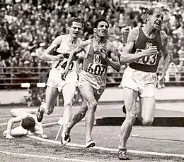 Emil Zátopek domine les épreuves de fond sur le plan international depuis 1948 : double champion d'Europe en 1950, il fait figure de favori des Jeux olympiques de 1952, à Helsinki. Titré quatre jours plus tôt sur 10 000 m, il remporte l'épreuve du 5 000 m après être revenu dans les 200 derniers mètres de la course sur le Britannique Christopher Chataway et le Français Alain Mimoun qui s'étaient portés en tête de la course. Zátopek s'impose dans le temps de 14 min 6 s 6, signant un nouveau record olympique[16]. Alain Mimoun est médaillé d'argent en 14 min 7 s 4, l'Allemand Herbert Schade médaillé de bronze en 14 min 8 s 6 alors que Chataway ne se classe que cinquième de la course après avoir heurté la lice et chuté lourdement[17]. Lors de ces Jeux d'Hesinki, Emil Zátopek réalisera un triplé inédit en remportant également l'épreuve du marathon.