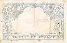 Quant au verso du type 1905, il fut entièrement dessiné et gravé par Duval et non par Dujardin : on voit des cornes d’abondance de fleurs et de fruits mêlés de monogrammes de la Banque de France entourant un grand cartouche blanc.