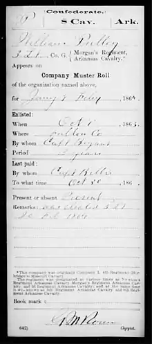 - Compagnie G – comté de Fulton, en Arkansas, enrôlée le , aussi connue comme la compagnie montée du capitaine Lorenzo Dow Bryant, qui comprend également quelques Missourians originaires des environs des comtés de Howell et d'Oregon. La compagnie est organisée en et est affectée au 4th Missouri Cavalry, en tant que (ancienne) compagnie I jusqu'au mois d', quand elle est détachée et affectée au 5th Arkansas Cavalry en tant que compagnie G.[3]
