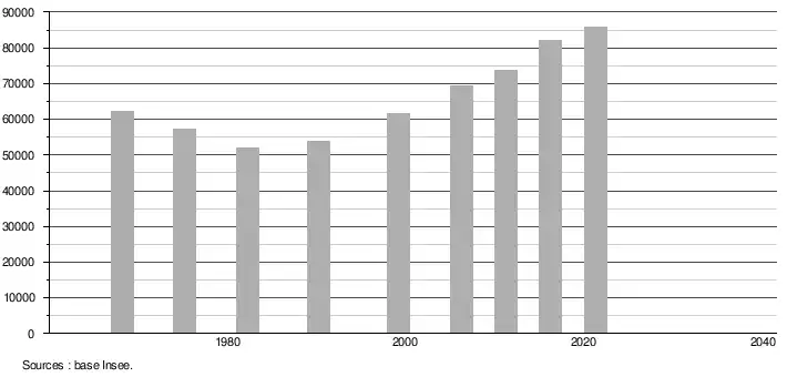 - Population municipale légale en vigueur au 1er janvier 2024, millésimée 2021, définie dans les limites territoriales en vigueur au 1er janvier 2023, date de référence statistique : 1er janvier 2021.