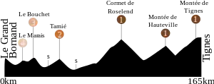 C'est la première véritable étape de montagne dans les Alpes (les coureurs n'ont eu qu'un col de 1e catégorie à franchir lors de la 7e étape) avec en fin d'étape le franchissement de trois sommets de 1e catégorie : le Cormet de Roselend (1 967 m), la montée d'Hauteville (1 639 m) et la montée de Tignes (2 088 m) où est jugée l'arrivée de l'étape. Comme entrée en matière, les coureurs doivent aussi franchir deux autres sommets en début d'étape, la côte du Bouchet-Mont-Charvin (931 m) et le col de Tamié (907 m).