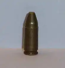 Une cartouche de 9 mm Glisenti : son aspect et ses dimensions sont proches de celles de la 9 mm Luger.