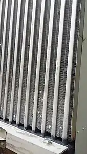 Il se compose de tubes dans lesquels la vapeur circule, tubes entourés d'ailettes facilitant l'échange, et de gros ventilateurs faisant circuler de l'air frais autour des tubes et au travers des ailettes.
